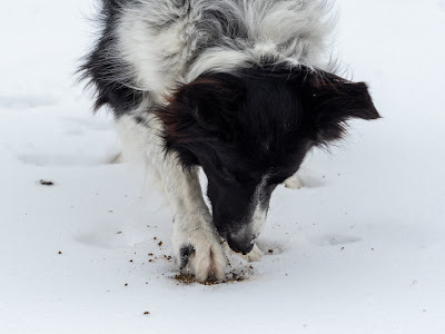 Oh no, wait. That isn't snow Rue is eating. She has found a frozen "cow pie" just below the surface. What a treat! In her opinion much better than a fudgsickle.